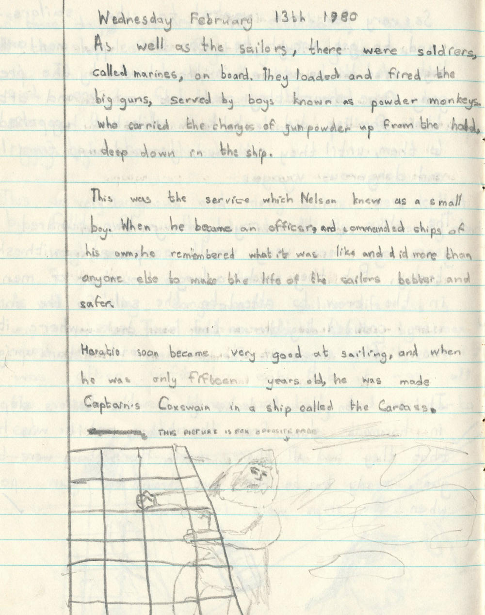 Another week, another page from The Story of Nelson - this time with a half-finished picture that a caption helpfully tells me isn’t even supposed to be here. Having now found a cheap old copy of the Ladybird book in question on ebay, I can safely say it’s supposed to be a picture of the 15-year-old Nelson climbing up the rigging of the HMS Carcass on an Arctic background. Instead I’ve drawn what looks to be some kind of cross between King Kong and Dave Lee Travis hanging off the side of a climbing frame.